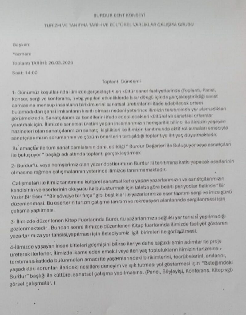 27.03.2026 Cuma günü saat 14.00’da Burdur Belediyesi Meclis Salonu’ nda B.K.K. Turizm, Tanıtma, Tarih ve Kültürel Varlıkları Koruma Çalışma Grubu aylık olağan toplantısını gerçekleştirdi.
